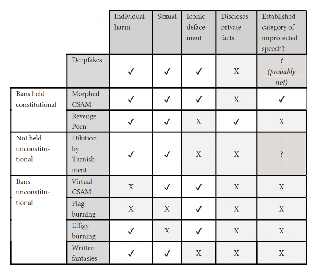 The constellation of features that characterize constitutional and unconstitutional regulations of outrageous iconography also underscores the constitutional precarity of anti-deepfake laws. On one hand, because anti-deepfake laws remedy harmful uses of images that target specific individuals, they are meaningfully distinct from unconstitutional attempts to regulate written sexual fantasies or nonindividualized harms like flag burning or virtual CSAM, or false statements generally. On the other hand, because covered deepfakes neither disclose private facts nor defame, and likely do not fall into an established category of unprotected speech, they differ meaningfully from iconic manipulations that courts have held constitutional to ban. Given this legal context, Part IV explains what defensible regulation of deepfake pornography might look like.